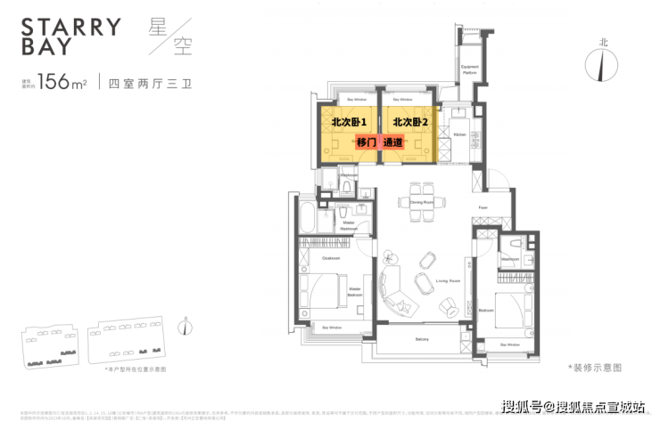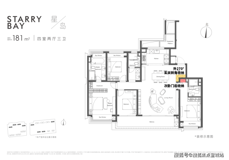 主力户型为四房三卫,得房率80%,客厅开间达11米,主卧套房含独立衣帽间及双台盆明卫