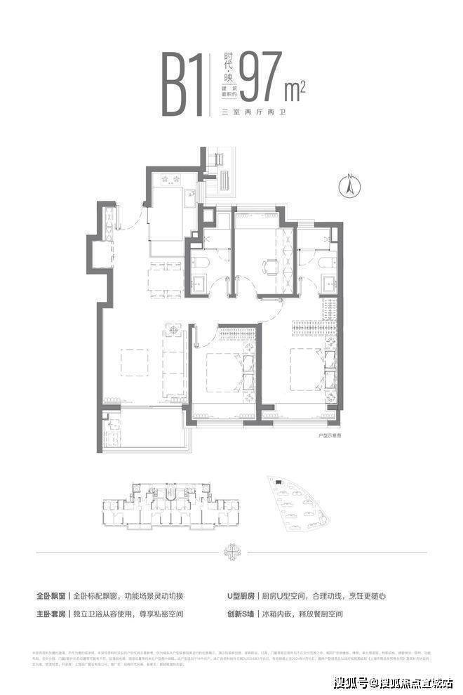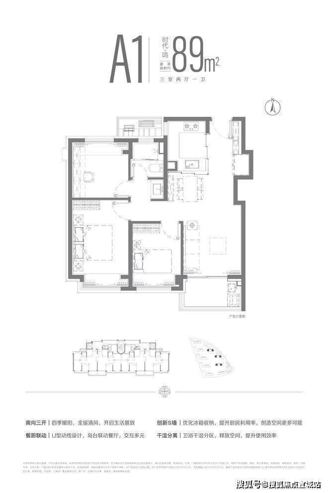 89㎡三房:创新“U型厨房+横厅设计”,实现小户型大空间感,满足年轻家庭首置需求。