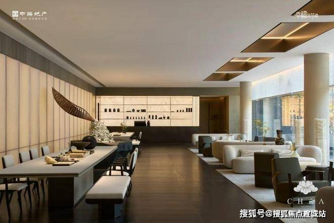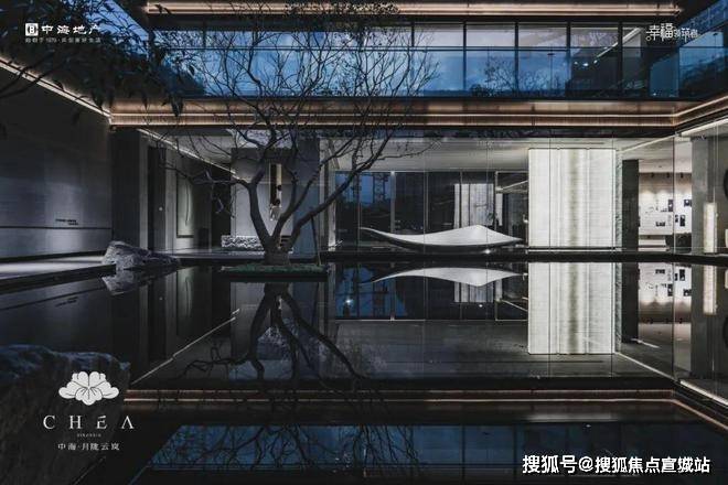 这座水庭也是一整面「水镜」,将中心的乌桕树、周围的超大白玻、精致的艺术雕塑都倒映其中。