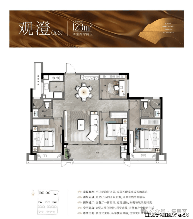 以中间套为例,建面约123㎡的户型做到了主次卧+客厅 四开间朝南,伸展开约13.3米的超大面宽,对应双开间阳台与飘窗的设计,进一步提升了全屋的采光。此外,一体化的餐客厅,“一镜到底”活动空间,在视觉上拉大了户型的朗阔尺度。