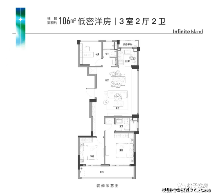 建面约106㎡的户型是市场上难得的小户型边套产品,南向双开间,同样的双联阳台打造,餐客厅一体化设计链接阔景飘窗,充分保证整个房间的采光面,后期居住舒适度更高。