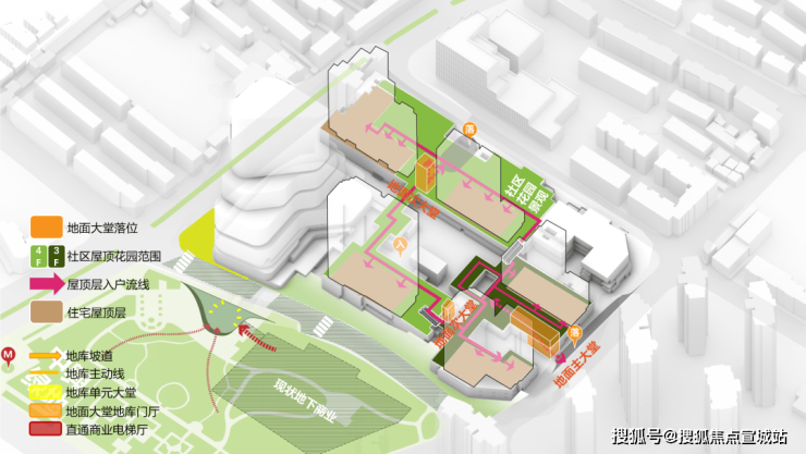 步行体验 为每个人规划不同动线 ;中興傲舍项目,基于人的关系的角度去设计动线,在高混的业态中,为住宅用户创造私密性和独立性,如到达高线公园这一层都有门禁,只有住户能够抵达,从而将简单的道路线条演变为丰富的空间内容:出与入的记忆、城市与社区的联系、公区与私域的桥梁。