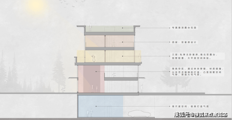 约6米层高,创新实现两层变四层,赠送地下室与前后双花园,实用率超200%。