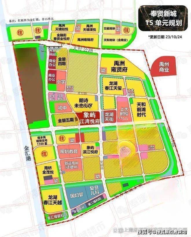 基本信息:项目坐落于奉贤区金汇镇金碧路与南行港路交汇处,属于奉贤新城 15 单元核心区,同时位于临港新片区辐射范围内。项目总占地面积约 4.66 万平方米,总建筑面积约 13.98 万平方米,规划有 11 栋 14-18 层高层住宅和 3 栋 6 层叠拼别墅,总户数达 1050 户,产权年限 70 年,容积率为 2.0,绿化率 35%。