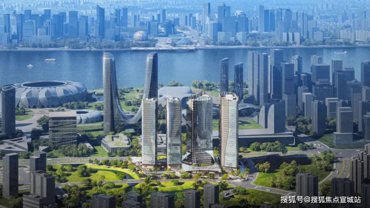 整个建筑群的布局沿着奔竞大道展开,由四栋塔楼和附属的酒店配套裙房共同组成。这个 26 万平方米的综合体项目,由七位行业大师联袂打造,其设计的核心理念是将国际化大师的智慧结晶、艺术性生活表达和杭州本土文化的融合,创新出一个独一无二的“城市会客厅”。