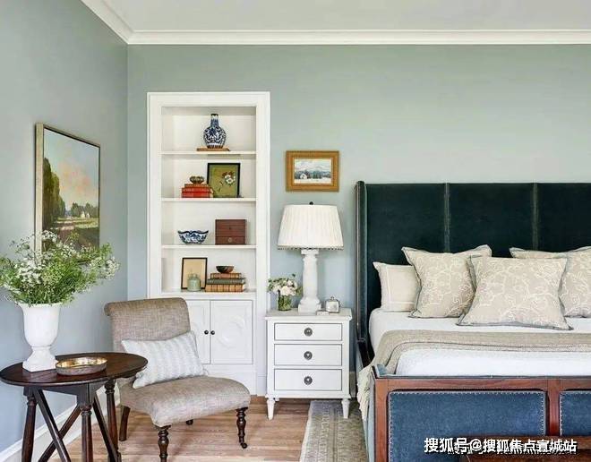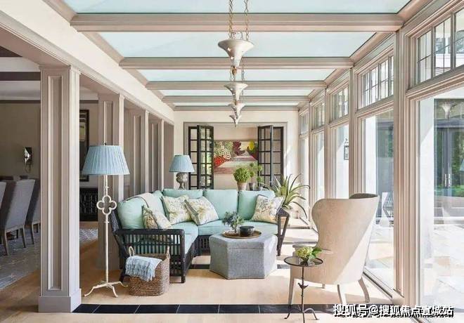 从客厅开始,整个空间都遍布着蓝色的元素,设计师以星座为主题进行设计,搭配上James Thomas的茶几、Holly Hunt的沙发、Minotti的扶手椅和Andrianna Shamaris的边桌,打造既高级又充满梦幻感的居家空间。