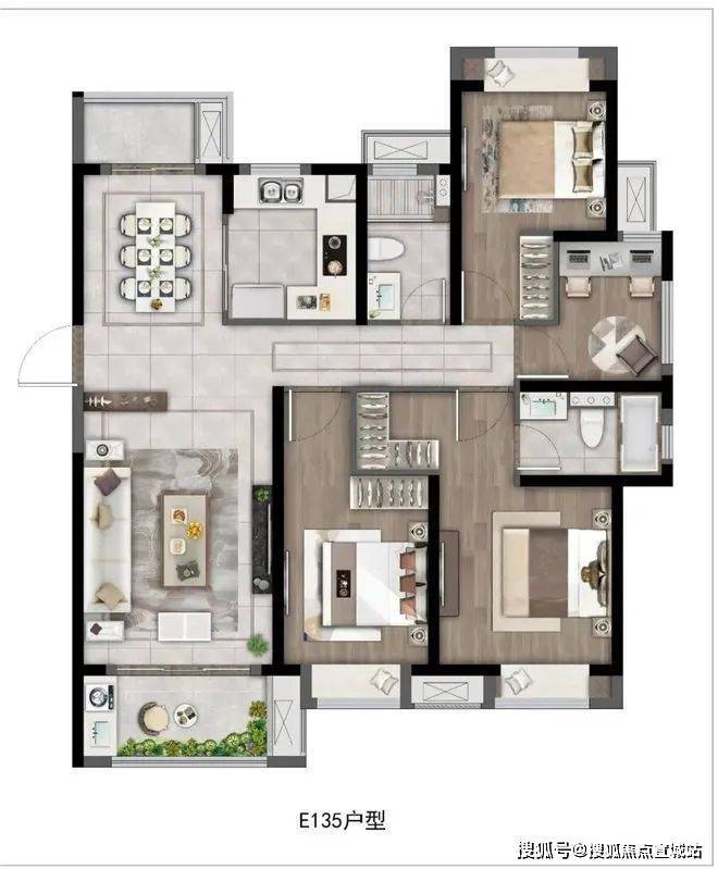 建面约135㎡4房2厅2卫,做到了三开间朝南+双卧室朝南+主卧套房设计+南北通透+动静分离+南北双阳台,这是一个“一步到位”的大4房户型。