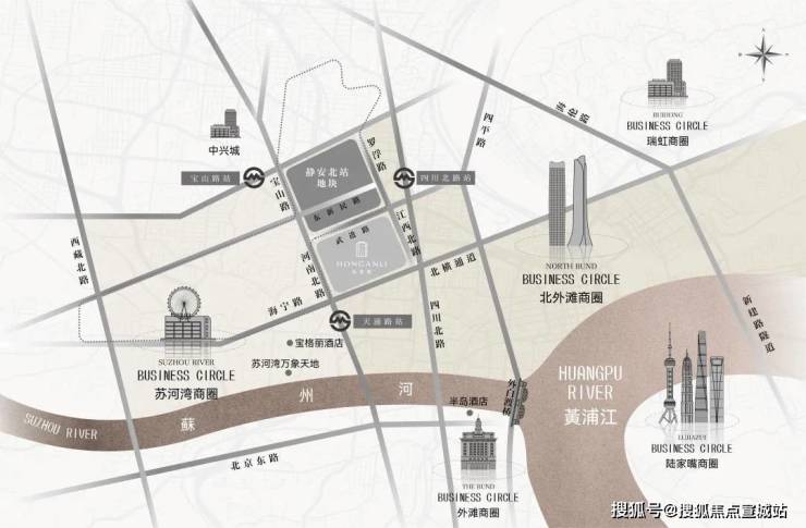 天目社区地块区位优势相当明显,直线距离苏州河约还不到1km、约2km内外滩、大悦城、四川北路、北外滩核心区、人民广场等大型CBD和商圈!