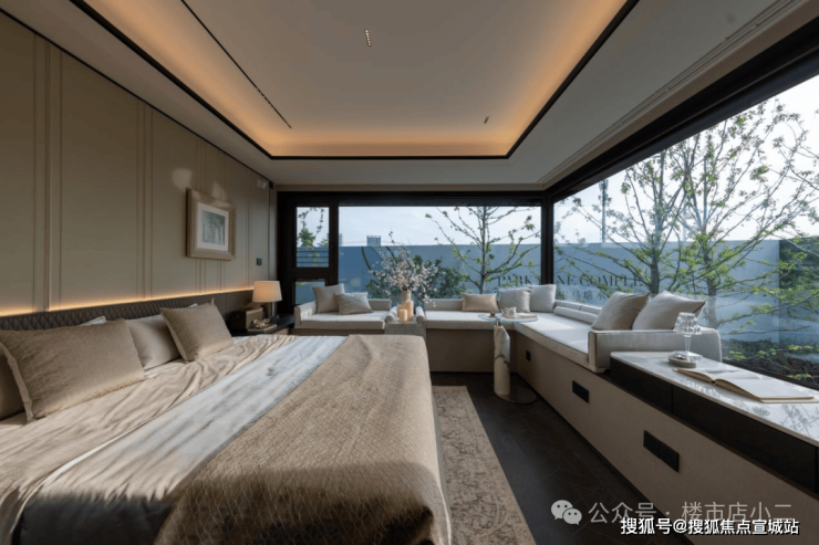 2#号楼的边套主卧户型配置270°环幕飘窗,不仅延伸空间尺度,更将水岸、园景“框”成私藏壁画。晨间,阳光透过飘窗铺满床榻;深夜,枕着河风与月光入眠,这是专属建面约165㎡的“观景特权”