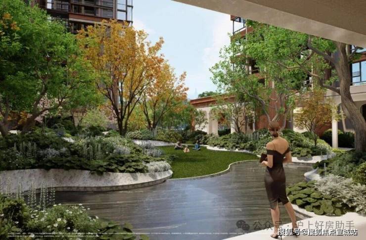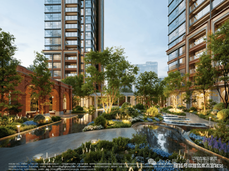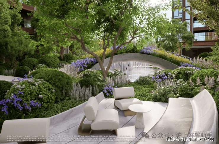 植物搭配上尽显巧思:油橄榄、铁冬青等带着南法风情的植物错落分布,各类花卉四季轮换绽放,春有繁花、夏有浓荫、秋有彩叶、冬有绿意,每一季都有不同的风景。材质选择上更是不吝成本:地面与墙面铺陈世茂金麻、贝金米黄等进口石材,业主可休憩的座位还选用稀缺的奥巴马木奢石,精选整块石材大面积通铺,纹理色泽犹如木材般自然温润;水景采用独特的波浪石材设计,水流淌过时灵动婉转,宛如自然馈赠的景致。更贴心的是社区地面的抬高设计,既有效隔绝了外界噪音与路人视线,保障居住私密性,又让景观更具层次感,置身其中则宛如繁华都市里的隐秘庄园,每一次下楼散步,都是与自然的温柔邂逅。