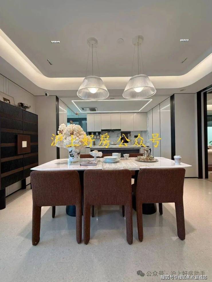厅内空间充裕,既容得下大家庭聚餐的超大圆桌,也有独立西厨岛台,满足高净值家庭多元烹饪需求。