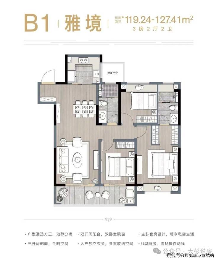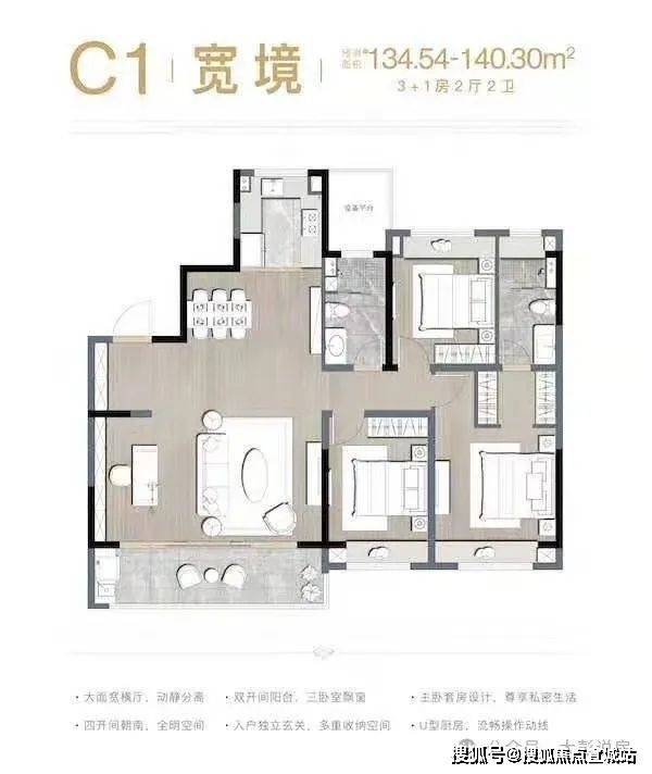 户型特点:122㎡户型为 3 室 2 厅 2 卫,南向三开间,双阳台设计;136㎡户型为 4 室 2 厅 2 卫,四开间朝南,U 型厨房。