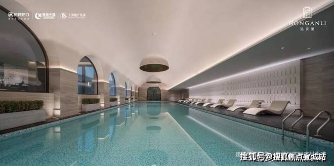 整个泳池天花板,呈现出海派拱形元素,落地玻璃窗外,是下沉式的景观空间: