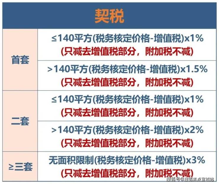 1、契税:普通住宅:90平米以下:1%。90-140平米:1.5%。140平米以上或是非普宅:3%。商业房或公司产权:3%2、城建税.营业税的7%。费附加税。营业税的3%。