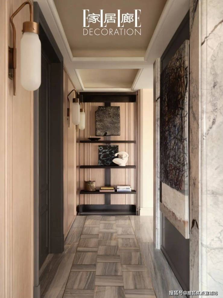 此外,空间中也尝试了基于材料的更多设计演化。父母房的吊灯同为特别定制,灯线采用皮革进行包裹,通过工艺的价值感深化作为长者空间的稳重气质。同时,为了弱化墙面较为密集的纹理对视觉的干扰,团队利用不同体块和肌理的艺术画作、艺术纸对墙面进行视觉转移。