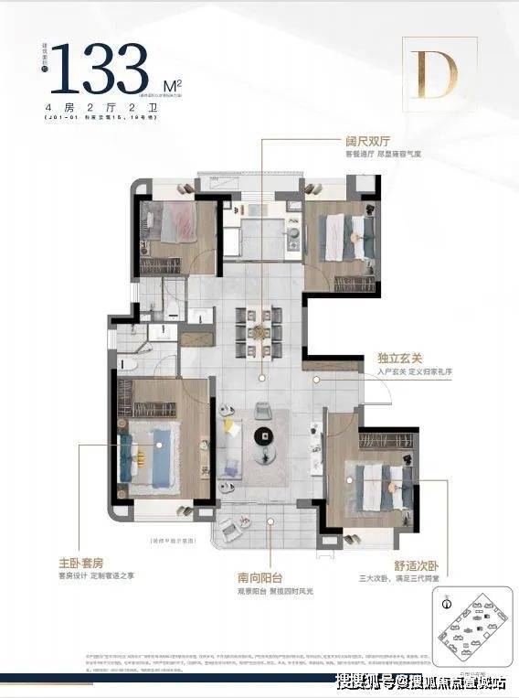 建筑面积约133㎡/143㎡四房两厅两卫,大开间,在满足空间感的基础上,增加户型的功能性,承载生活高舒适度;其中建筑面积约133㎡的四叶草户型,主卧套房设计,三代同堂各有私密天地;南向观景阳台,饱览阳光美景,双卫设计,提供更多私密空间与生活便利。