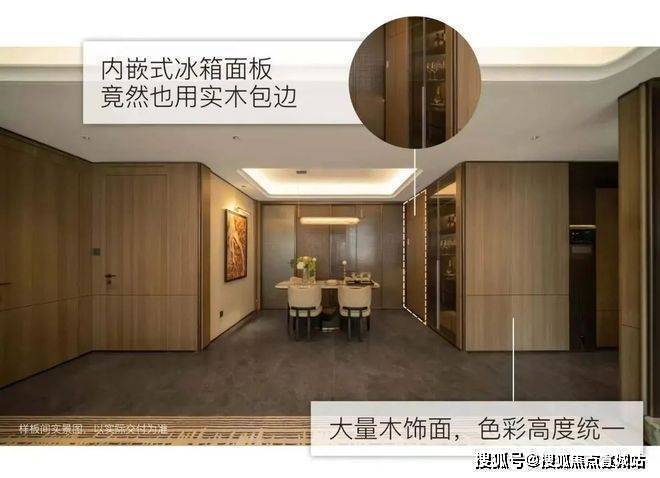 项目墙面铺设大量木饰面,相比墙布,更具质感更温馨。同时为了保持室内色调的统一,建面126㎡内嵌式冰箱的面板也采用木饰面。