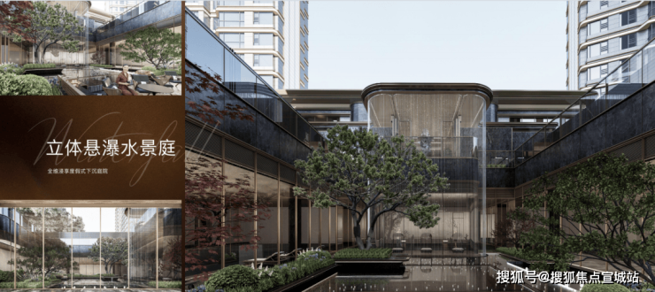 下沉式环幕庭院,跌水景观环绕,池底仿黑金砂与宝石晶片闪烁,点缀百余灯珠,师法“琉璃水光” 形意,糅合视听五感,打造全浸式立体园境,天工巧夺,嘉定未见。