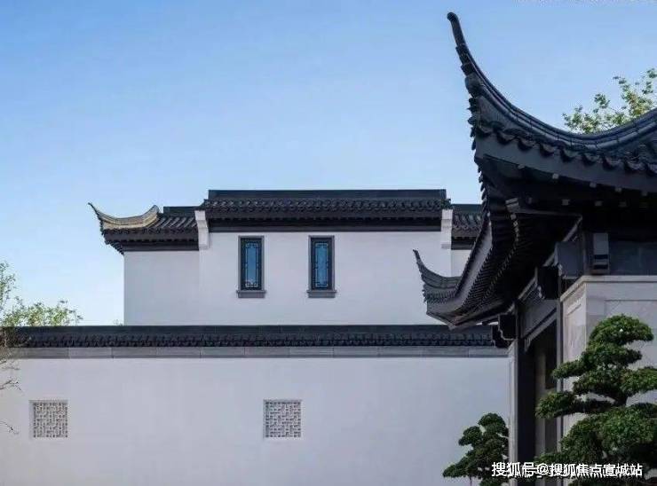 建筑美学:粉墙黛瓦、宋式飞檐,局部香槟色铝板与玻璃幕墙融合,复刻江南民居精髓。