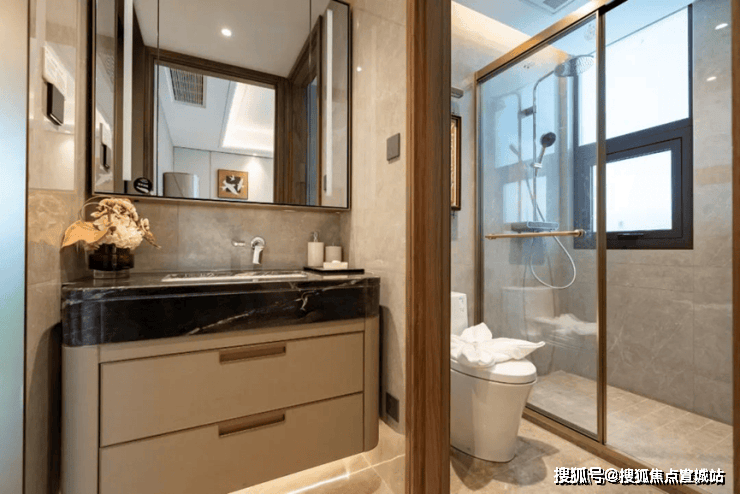 卧室墙面采用局部墙布+局部硬包,地面是书香门地实木复合地板铺就。样板间实景图卫生间甄选唯宝的台下盆、汉斯格雅的龙头+恒温花酒,玫瑰岛的淋浴房,科勒的智能一体马桶+浴缸+浴缸龙头等,生活质感肉眼可见。更有众多人性化细节,包括加热毛巾架,淋浴屏,定制台盆柜+镜柜等,省去后期定制比价的烦恼。